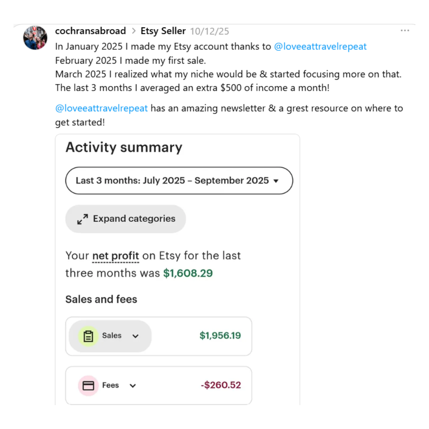 "In January 2025 I made my Etsy account thanks to Janeen. February 2025 I made my first sale. March 2025 I realized what my niche would be & started focusing more on that. The last 3 months I averaged an extra $500 of income a month!"